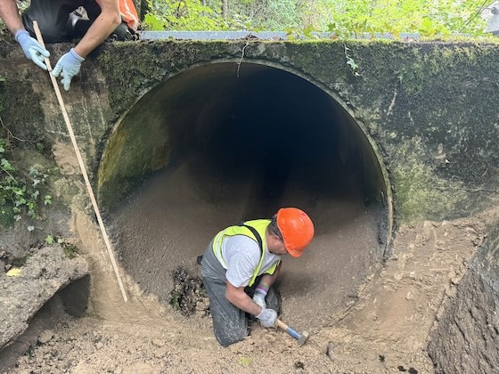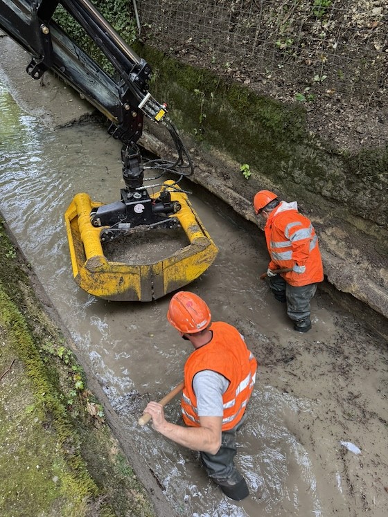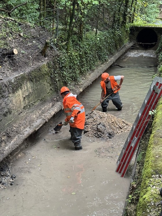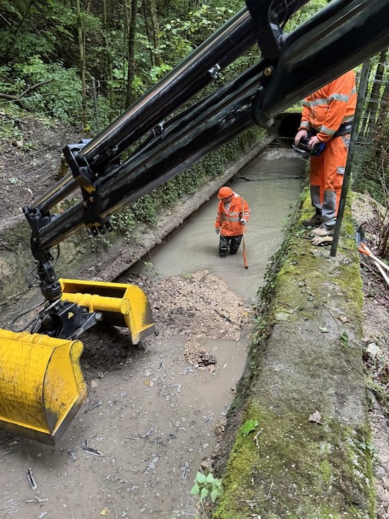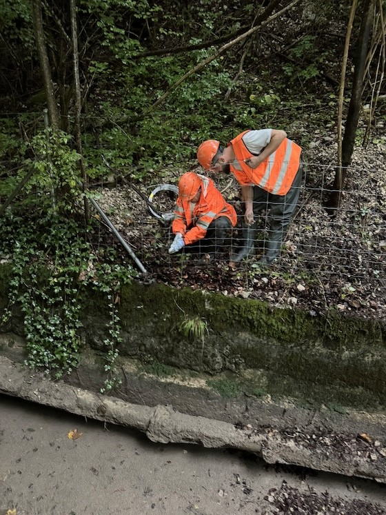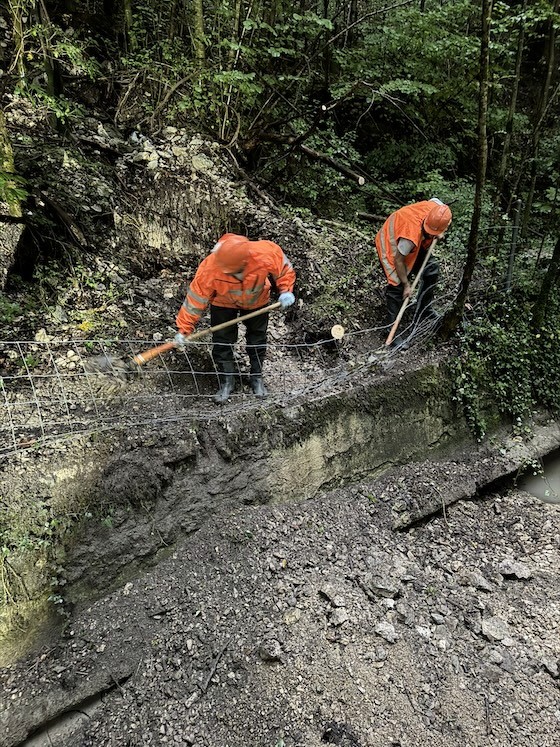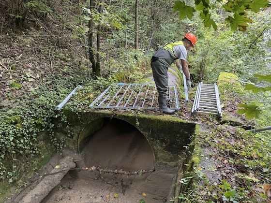 Nach einem Erdrutsch durften wir umfassende Instandsetzungsarbeiten an der betroffenen Infrastruktur durchführen. Ein beschädigter Zaun wurde instandgesetzt und neu montiert, zudem musste ein mit abgerutschtem Material gefüllter Wasserkanal unter speziellen Bedingungen freigeräumt werden. Der Zugang zum unterirdisch geführten Wasserkanal wurde mit einem von uns gefertigten, hochschiebbaren Schutzgitter ausgestattet. Die Planung und Ausführung des gesamten Projekts erfolgte durch uns. Aufgrund der Hanglage und der eingeschränkten Zugänglichkeit kam ein Mobilbaukran mit Greifzange zum Einsatz. Zusätzlich mussten mehrere vom Erdrutsch betroffene Bäume fachgerecht gerodet werden.