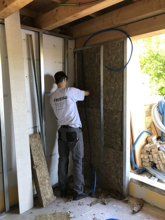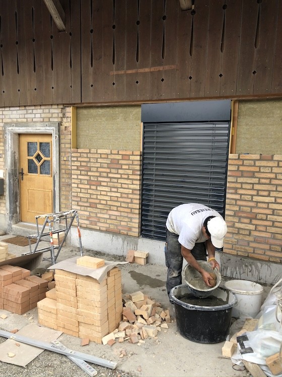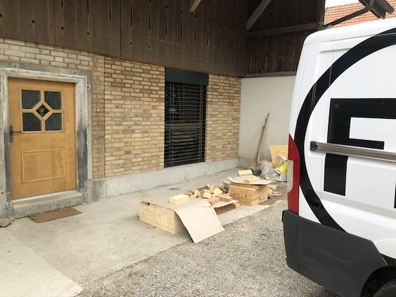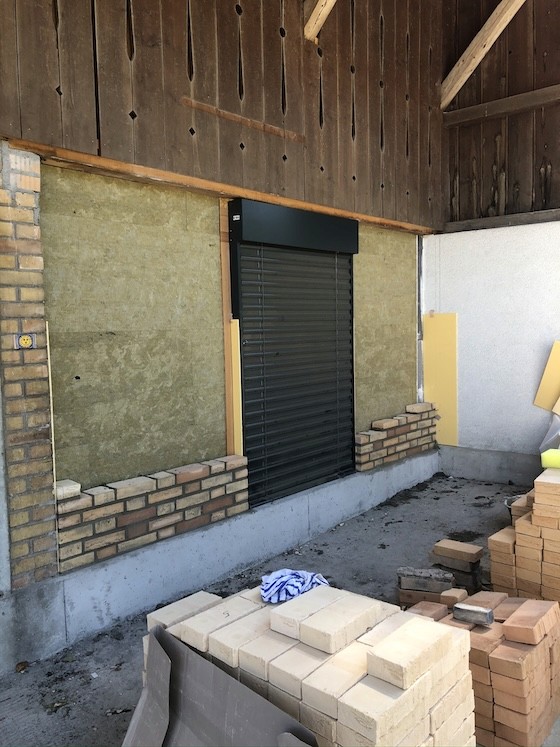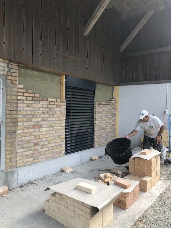 In einem Bauernhaus, das als Mehrgenerationenhaus mit Gewerbeanteil genutzt wird, durften wir eine bestehende Garage zu einem bewohnten Zimmer umbauen und damit die Wohnfläche einer Erdgeschosswohnung erweitern. Der Raum wurde vollständig isoliert und für die neue Nutzung vorbereitet. Als gestalterisches Element erstellten wir einen Betonsockel, auf dem ein Sichtmauerwerk gemauert wurde, das sich bewusst am bestehenden Mauerwerk orientiert. Durch die Verwendung verschiedenfarbiger alter beziehungsweise auf alt gemachter Backsteine fügt sich der neue Raum harmonisch in den Bestand ein.